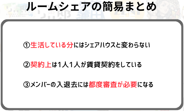 しかしルームシェアはあくまで複数名で1つの物件への賃貸契約を許可しているだけなので、転貸借をOKとしているかどうかは別です。