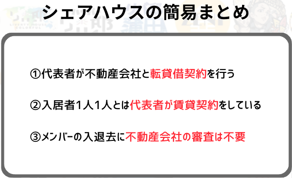 メンバーの入れ替わりがあることを前提に、管理人が物件の全てのリスクを背負って賃貸契約をします。
