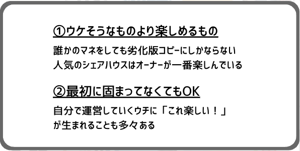また、ウケてるシェアハウスのコンセプトをパクっても、それはただの二番煎じ。