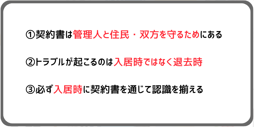 退去時も退去した後も気持ち良い関係でいられるように、最初にしっかり条件について双方納得した上で入居案内をしましょう。