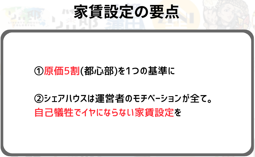 これはシェアハウス業界の相場みたいなものなのですが、入居率50%で物件家賃を支払える家賃に設定するのが一般的です。