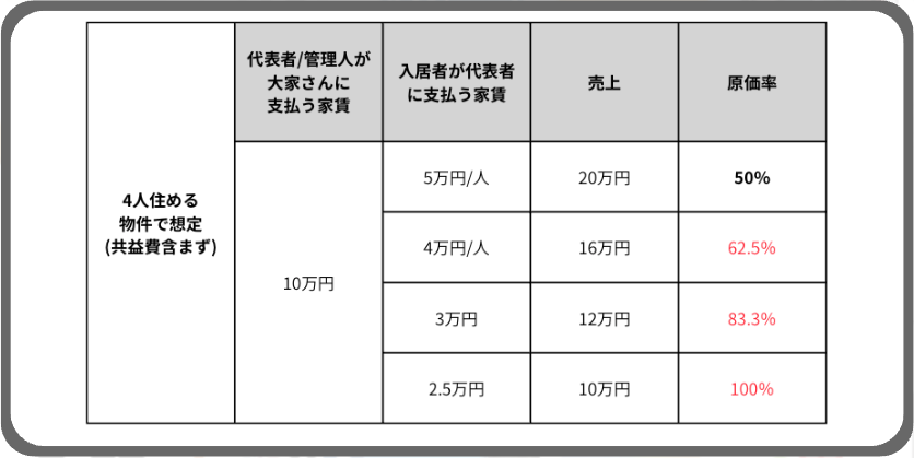 たとえばですが、4人住める物件で家賃が10万円だった場合は2人で10万円は回収できるように設定しなくてはいけないので、1人5万円の家賃設定となります。(水道光熱費は別計算)